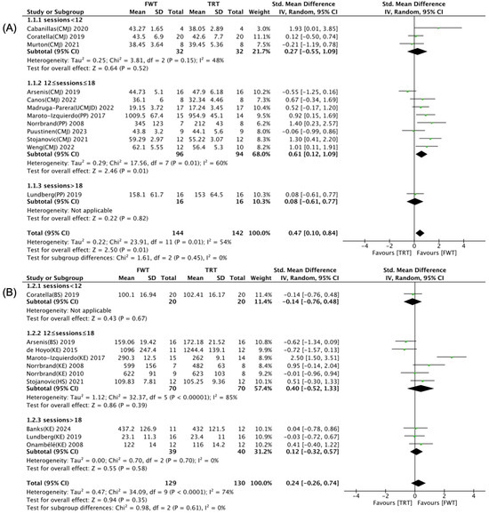 Forest plot with subgroup analysis of total number of training sessions [35,36,37,38,39,40,41,42,43,44,45,46,47,48,49,50]. (A) Effect of total number of training sessions on muscle power. (B) Effect of total number of training sessions on maximal muscle strength.