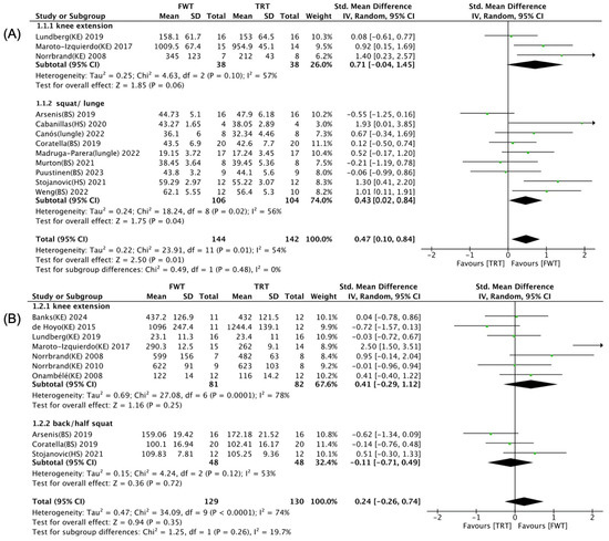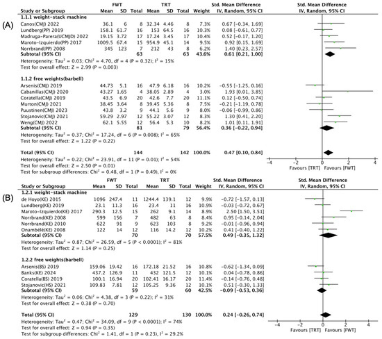 Forest plot with subgroup analysis of selected exercise [35,36,37,38,39,40,41,42,43,44,45,46,47,48,49,50]. (A) Effect of selected exercise on muscle power. (B) Effect of selected exercise on maximal muscle strength.