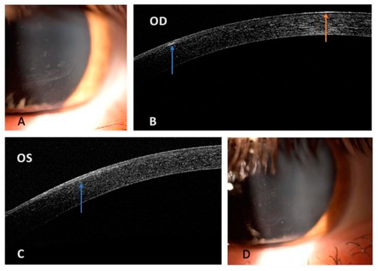 Patient’s slit-lamp and anterior segment optical coherence tomography images. (A) Slit-lamp photograph of the right eye showing elongated irregular opacities of the corneal epithelium. (B,C) Anterior segment optical coherence tomography scans of both eyes. The corneal stroma and the underlying layers have a normal aspect. (B) Presence of an abnormal spot of the epithelial basement membrane (blue arrow) and an irregular hyperreflective region of the corneal epithelium (orange arrow) in RE. (C) Evidence of diffuse thickening of the epithelial basement membrane, resulting in a large highly reflective area (blue arrow) involving the overlying epithelium in LE. (D) Slit-lamp photograph of the left eye demonstrating geographic map-like lines surrounding epithelial dots. RE: right eye; LE: left eye.