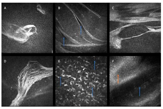 In vivo confocal microscopy images of EBMD-affected corneal layers. (A) Irregularly shaped extracellular hyperreflective deposits in the basal epithelium (depth 44 µm). (B) Hyporeflective lines (blue arrows) interspersed between highly reflective curvilinear changes in the basal epithelium (depth 46 µm). (C) Linear and ring-shaped highly reflective material in the epithelial basement membrane (depth 55 µm). (D) Sheetlike deposits in epithelial basement membrane (depth 63 µm). (E) Highly reflective microdots (blue arrows) spread in the anterior stroma (depth 82 µm). (F) Descemet membrane folds (orange arrow) and hyporeflective striae (blue arrow) in the posterior stroma (depth 465 µm). These findings may represent pressure-induced artifacts and should be distinguished from pathological changes.