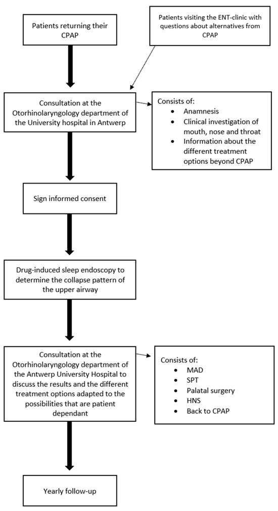 Inclusion criteria are adult patients (age starting from 18 years old) with moderate to severe OSA (AHI ≥ 15/h) who have been shown to be CPAP-intolerant or non-compliant and are willing to explore alternative treatment options. When returning the CPAP device, patients will be informed about the possibility of a consultation regarding alternative treatment options (Figure 1). Patients will be contacted by phone to ask for the main reason to cease CPAP therapy and, if interested in alternative therapy, will be invited to a designated consultation at the ENT department. Factors for CPAP cessation will be documented and analyzed in further investigation to better predict CPAP failure and adherence to alternative treatment. All patients will be asked to provide written informed consent.