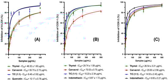 Results of the anti-inflammatory activity via COX/LOX pathway of both thymol and carvacrol along with their equimolar mixture (1:1), against 5-LOX (A), COX-1 (B), and COX-2 (C). Quercetin was used as a positive control for 5-LOX, while indomethacin was used as a positive control for COX-1/2. Data are presented as mean ± standard deviation. The experiments were conducted in three replicas.