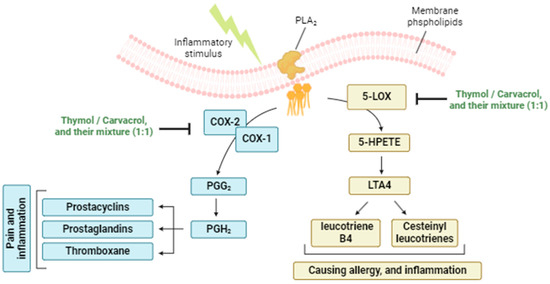 The probable mechanism of action for the significant anti-inflammatory activity of these two compounds, lies primarily in the inhibition of key enzymes of the arachidonic acid pathway: 5-lipoxygenase (5-LOX), cyclooxygenase-1 (COX-1), and cyclooxygenase-2 (COX-2) [60,61,62]. By inhibiting 5-LOX, these compounds reduce the production of leukotrienes, pro-inflammatory mediators associated with pathologies such as asthma and allergies [63]. In addition, although they may slightly inhibit COX-1, which could limit side effects on gastric mucosa and other physiological functions, their action is mainly directed against COX-2, an inducible enzyme that catalyzes the production of pro-inflammatory prostaglandins [64,65]. By specifically targeting COX-2, thymol and carvacrol can effectively reduce pain and inflammation while preserving the protective functions of COX-1 [66]. The equimolar (1:1) mixture of these two compounds seems to enhance their ability to inhibit the 5-LOX, COX-1, and COX-2 enzymes, enabling a more significant reduction in inflammation [67]. This synergy maximizes the anti-inflammatory effect while minimizing side effects, notably by preserving COX-1 activity [68].