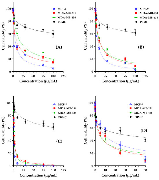 Cell viability of MCF-7, MDA-MB-231, MDA-MB-436, and PBMC after 72 h of treatment with thymol (A), carvacrol (B), and thymol/carvacrol combination (C) and cisplatin (positive control, (D)) using MTT test.