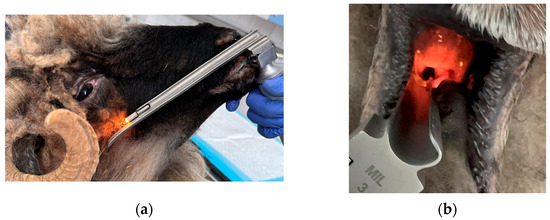 (a) Intubation using a laryngoscope with a Miller blade; (b) visualization of the larynx.
