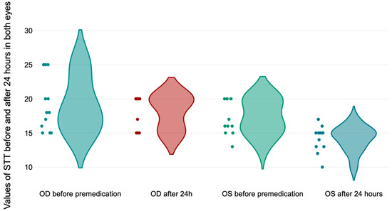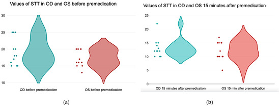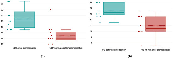 (a) Values of the Schirmer Tear Test in the right eye (OD) before premedication and 15 min after premedication; (b) values of the Schirmer Tear Test in the left eye (OS) before premedication and 15 min after premedication.