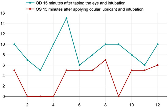 After 24 h (T4), we evaluated the return of the tear production values at baseline. In the right eye (OD), which was taped during anesthesia, the results of the paired-t test indicate that there is a non-significant small difference between the values of the STT before premedication (M = 19.08, SD = 3.96) and 24 h after premedication (M = 18.03, SD = 2.42), t(11) = 1.1, p = 0.137, compared with the values for the left eye (OS), who received the ocular lubricant where the results of the paired-t test indicated that there is a significantly large difference between the values of the STT before (M = 17.33, SD = 2.53) and after 24 h from premedication (M = 14.16, SD = 1.89), t(11) = 4.4, p < 0.001 (Figure 9).