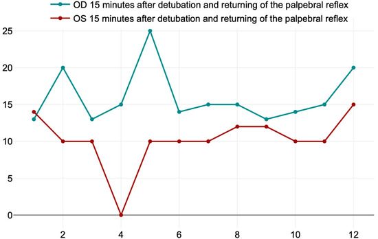 The mean values ± SD of basal tear production, expressed in millimeters/min, measured before premedication (T0) on right (OD) and left eye (OS), were 19.08 ± 3.96 mm/min and 17.33 ± 2.53 mm/min, respectively (Figure 5a). The mean values ± SD in both eyes after 15 min of premedication (T1) were 13.08 ± 3.31 mm/min for the right eye (OD) and 12 ± 3.43 mm/min for the left eye (OS) (Figure 5b).