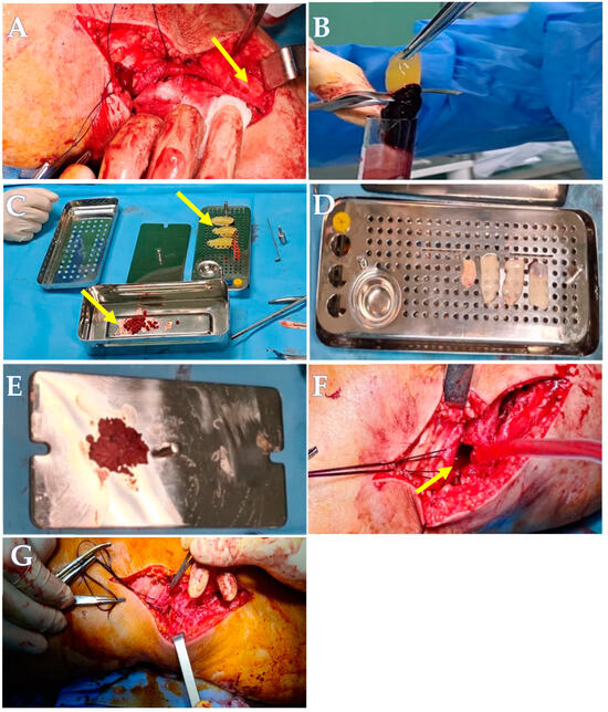 The sticky bone procedure. (A) Harvest area of the bone chips. (B) Extraction of the PRF membrane. (C) PRF membrane and bone chips. (D) PRF membrane after compressing with metal cover. (E) Final product, sticky bone. (F) Tibial defect. (G) Tibial defect filled with sticky bone.