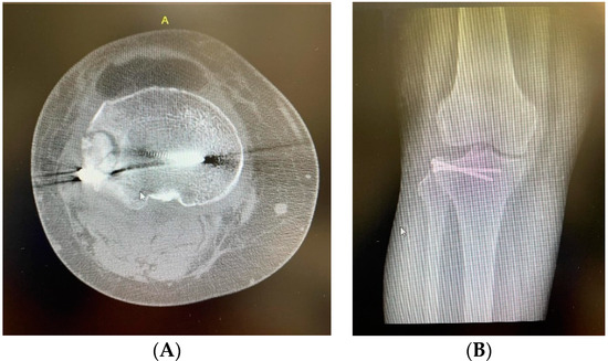 The patient was discharged 48 h postoperatively. Functional treatment commenced on the second postoperative day, adhering to a rehabilitation program that included continuous passive motion (CPM), static quadriceps exercises, and active movements of the knee and ankle. Weight bearing was restricted for 10 weeks postoperatively. At a follow-up appointment, 13 months after surgery, the patient exhibited a full range of motion in the knee joint without pain. The postoperative scar demonstrated a normal appearance, with no signs of inflammation, as observed in Figure 3A,B.