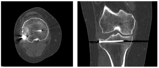 Axial (left) and coronal (right) computed tomography of the right knee, at 18 months follow-up.