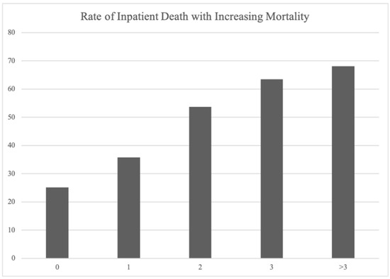 The subdural hematoma mortality score showed accurate prediction of inpatient mortality when applied to a select cohort of patients with moderate-to-severe chronic subdural hematoma in 2019 (Figure 2). The mortality rate associated with a score of 0 was 25.2%. It was followed by a 35.7% mortality rate associated with a score of 1, 53.7% associated with a score of 2, 63.5% associated with a score of 3, and 68% associated with a score above 3 (Figure 2).