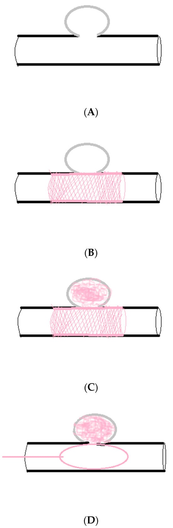 - Sasaki, K.; Ueda, K.; Nishiyama, A.; Yoshida, K.; Sako, A.; Sato, M.; Okumura, M. Successful utilization of coronary covered stents to treat a common hepatic artery pseudoaneurysm secondary to pancreatic fistula after Whipple’s procedure: Report of a case. Surg. Today 2009, 39, 68–71. [Google Scholar] [CrossRef] [PubMed]