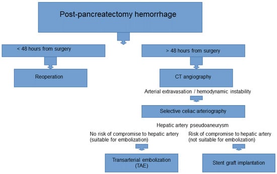 - Herzog, T.; Suelberg, D.; Belyaev, O.; Uhl, W.; Seemann, M.; Seelig, M.H. Treatment of acute delayed visceral hemorrhage after pancreatic surgery from hepatic arteries with covered stents. J. Gastrointest. Surg. 2011, 15, 496–502. [Google Scholar] [CrossRef] [PubMed]