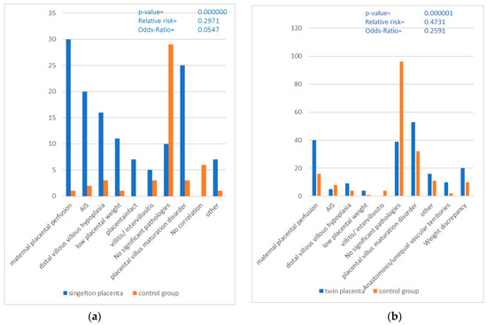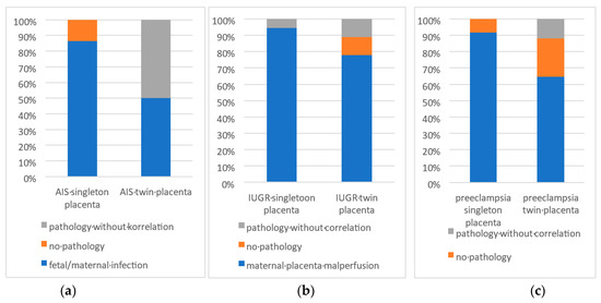 It can be seen that the pre-selection of placentas using a standardized request form in the group of placentas from singleton pregnancies showed a higher correlation between the clinical indication for a histopathological examination and the actual pathological findings. Thus, significantly more pathologies were detected in the group of singleton placentas with a clinical indication than in the group of placentas from twin pregnancies with a clinical indication. There may be several reasons for this. On the one hand, it may be due to the fact that, in the control group, twin placentas with the indication of a premature birth were sent in, which, according to the gestational age, corresponded to a premature birth, i.e., they were born before the 37th week of pregnancy. Strictly speaking, these placentas usually have no histomorphological findings, as both mother and child were healthy, but, in this study, these cases were nevertheless included in the statistics, as they were placentas from probably healthy pregnant women with an unremarkable birth and unremarkable postnatal course in child and mother. For example, placental villi from twin placentas with prematurity often show a villous maturity disorder or a villous maturity that corresponds to a placenta of the late third trimester. Maternal placental malperfusion [8,14], which was detected in some of the control group of twin placentas, can also be associated with prematurity or multiple pregnancies. In these cases, however, they often have no pathological value for the newborn, but are only seen as histopathological findings under the microscope.
