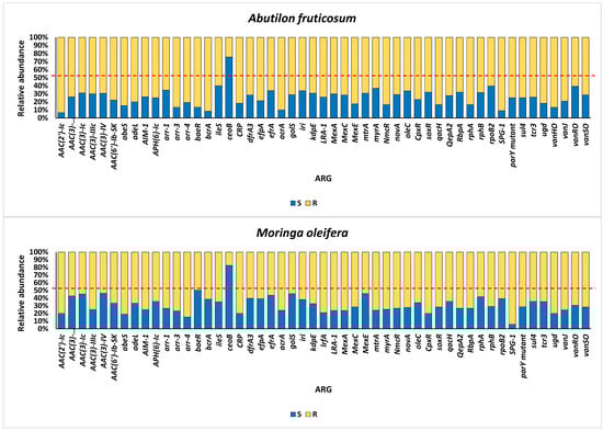 Relative abundance of ARGs frequently encountered concurrently within the rhizospheric (R) and bulk (S) soil microbiomes of the two wild botanical specimens Moringa oleifera and Abutilon fruticosum. The red line represents a 50% relative abundance. Further information is available in Tables S3 and S4.