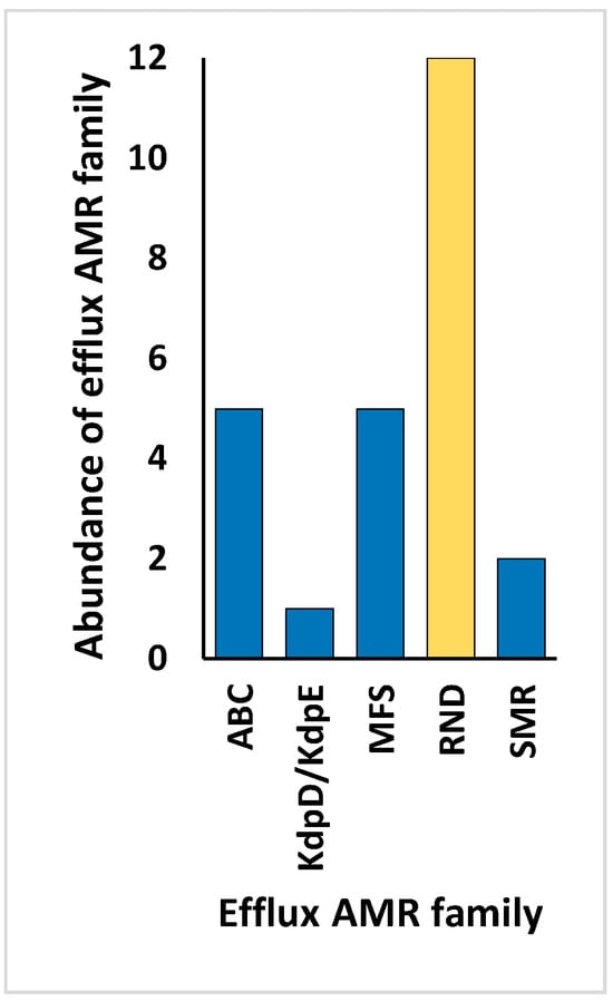 The average abundances of the predominant bacterial species were, respectively, 86.75, 1183.67, 421.08, and 62.92 for M. oleifera, and 152.62, 891.79, 314.03, and 66.63 for A. fruticosum (Tables S14 and S15). The numbers of the prevalent species within these genera were 7, 7, 2, and 3 for M. oleifera, and the corresponding values for A. fruticosum. Notably, the average abundance of the most harmful bacterial species, e.g., Mycobacterium tuberculosis, was as high as 5803.42 for M. oleifera and 4165.92 for A. fruticosum. Presently, there is a more comprehensive understanding of antibiotic resistance mechanisms in bacteria []. These mechanisms encompass active efflux, wherein transmembrane efflux pumps facilitate the expulsion of antibiotics from bacterial cells, consequently diminishing their intracellular concentration []. Conversely, the diminished influx is orchestrated by modifications in membrane permeability, achieved through the downregulation of porins. Porins, the integral transmembrane proteins pivotal in facilitating the translocation of a plethora of molecules, antibiotics among them, across bacterial membranes, undergo notable alterations [].