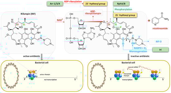 - Quan, S.; Imai, T.; Mikami, Y.; Yazawa, K.; Dabbs, E.R.; Morisaki, N.; Iwasaki, S.; Hashimoto, Y.; Furihata, K. ADP-ribosylation as an intermediate step in inactivation of rifampin by a mycobacterial gene. Antimicrob. Agents Chemother. 1999, 43, 181–184. [Google Scholar] [CrossRef] [PubMed]