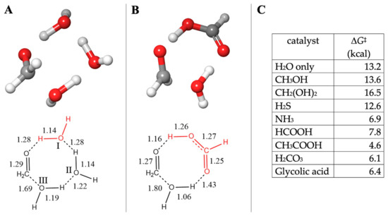 To investigate if prebiotically plausible small molecules potentially present in the solution can catalyze this reaction, we replace the water molecule I with CH3OH, CH2(OH)2, NH3, or H2S. (Replacing the water molecule II is either less or equally favorable.) Or we can replace both water molecules I and II with a carboxylic acid moiety, as shown in Figure 2B with formic acid. This optimal transition state structure is geometrically similar to the eight-center water-only transition state in Figure 2A, but there are some notable differences in the bond distances. The acidic proton of HCOOH is 1.16 Å to the carbonyl-O, while the corresponding distance is 1.28 Å for the uncatalyzed reaction. The hydrating water molecule has a longer C…O distance of 1.80 Å instead of 1.69 Å in the water-only transition state. These are consistent with an acid-catalyzed mechanism where the proton transfer proceeds ahead of the nucleophilic addition of the reactant water to CH2O.