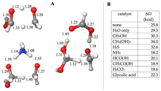 The lowest energy transition state had an uncatalyzed barrier of ΔG‡ = 25.8 kcal and did not require additional explicit water molecules (adding them increased ΔG‡). The hydride is transferred directly between the two carbons as the proton hops between the oxygens, as shown in Figure 3A. A catalyst molecule can be added in two possible positions: between the two carbons to facilitate the hydride transfer or between the carbonyl-O of CH2O and the hydroxyl of CH2(OH)2 to facilitate proton transfer. In all cases, the latter situation was favored.