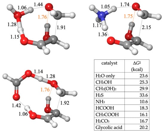 Throughout this paper, for the thermodynamics of a chemical reaction, the reaction free energy will be designated ΔG. For a transition state, kinetic barriers will be designated ΔG‡ and will typically refer to the forward direction. From the ΔG and ΔG‡ values for the forward reaction, the thermodynamics and kinetics of the reverse reaction can be easily ascertained. All numerical values are in kcal/mol, abbreviated as kcal. In each subsection, we begin with the uncatalyzed reaction (water may facilitate proton transfer) before examining the inclusion of a potential catalyst. The potential catalysts in this study are NH3, H2S, methanediol (the hydrated form of CH2O, which is dominant in aqueous solution), the C1 Cannizzaro products CH3OH and HCOOH, along with three other acids (carbonic, acetic, and glycolic) that are likely to be present in prebiotic systems.
