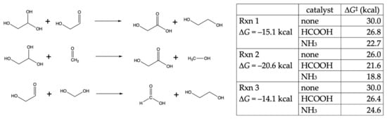 At this point, we have considered four distinct reaction mechanisms: C–O bond formation (hydration), C–C bond formation (aldol), non-redox H-shifts via enolization, and redox H-shifts in the Cannizzaro disproportionation. Because the remaining reactions in this paper will recapitulate similar transition states, we will focus our attention mainly on NH3 and HCOOH as proxy catalysts and compare these to only having water molecules as a proton shuttle.