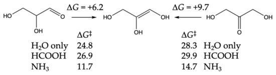Glyceraldehyde favorably isomerizes into dihydroxyacetone in aqueous solution. Our calculated ΔG for the reaction is −3.5 kcal, and the uncatalyzed barrier is 24.8 kcal (very similar to the 24.3 kcal enolization barrier for glycolaldehyde). The isomerization is a two-step reaction going through an enol intermediate. Figure 7 shows the ΔG and ΔG‡ values for enol formation. Since dihydroxyacetone is more stable than glyceraldehyde, these values are 3.0–3.5 kcal higher starting from dihydroxyacetone. The enolization barriers of glyceraldehyde with HCOOH and NH3 are very similar to those for glycolaldehyde, as expected, since the transition states are structurally similar. Uncatalyzed, the isomerization is relatively slow, but lower barriers with the proxy catalyst NH3 allow for more rapid interconversion. Dihydroxyacetone could be one way to sequester glyceraldehyde.