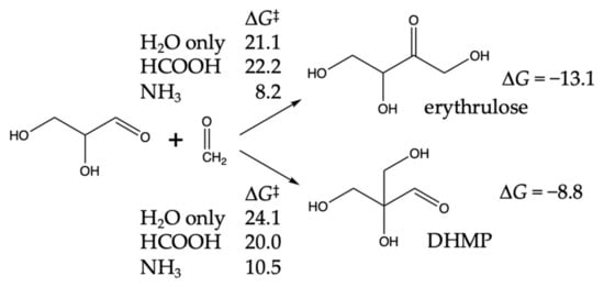 For the C3 + C1 → C4 aldol addition, we had previously determined [19] that the path to forming the ketone erythrulose had lower (uncatalyzed) barriers compared to forming the aldehydes, erythrose, or threose. However, we had not considered the formation of a branched tetrose 2,3-dihydroxy-2-(hydroxymethyl)propanal, which we will refer to as DHMP. Our results are shown in Figure 8.