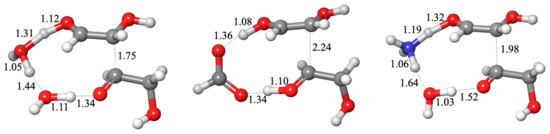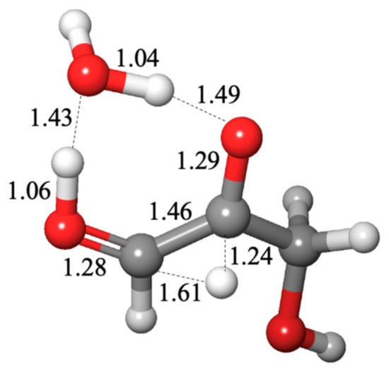 Additionally, Appayee and Breslow [3] proposed a 1,2-hydride shift for the isomerization of glyceraldehyde to dihydroxyacetone based on deuterium labeling experiments. According to their mechanism, this conversion is catalyzed by Ca2+ and hydroxide ions. Because our protocol is limited to neutral species (as discussed in Section 2), we can only investigate this with neutral molecule catalysts. The optimal transition state has one mediating water molecule between the oxygens, as shown in Figure 9. The proton from the 2-hydroxy group has been mostly transferred (H…O is 1.49 Å), while the middle C…H (at 1.24 Å) is only just starting to break. This is somewhat analogous to Appayee and Breslow’s proposed mechanism, where deprotonation takes place before the deuterium transfer. However, our calculated ΔG‡ is 30.0 kcal, which is higher than enolization. Adding HCOOH or NH3 in place of the mediating water molecule does not lower the calculated barrier.