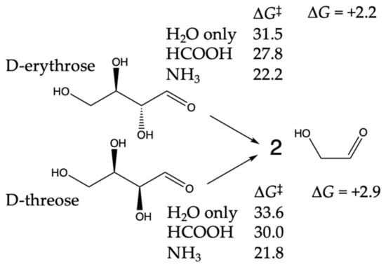 We had not considered the retro-aldol C4 → C2 + C2 in our previous work, so we will examine it more carefully here. Our results are shown in Figure 10. The retro-aldol splitting is marginally endergonic. Since D-threose is more stable than D-erythrose by 0.7 kcal, the retro-aldol of D-threose is 0.7 kcal more endergonic, and its corresponding barriers are also marginally higher. At over 30 kcal/mol for the water-only barriers, the uncatalyzed retro-aldol is expected to be quite slow at room temperature. HCOOH and NH3 proxy catalysts lower ΔG‡, but these values are still over 20 kcal/mol. It is not surprising that the retro-aldol (being endergonic) has higher barriers than the (exergonic) aldol additions.