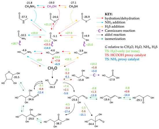 Figure 12 is only a very small part of what may take place in a messy formose reaction if NH3 and H2S are present. All the reactions in the top half only show reacting C1 species, but because the formose reaction generates C2, C3, and C4 aldehydes, ketones, alcohols, and carboxylic acids (the latter two via Cannizzaro reactions), these can further react with each other and with NH3 and H2S. While we do not have all these calculations completed, what we have presented thus far allows us to make reasonable first approximations of both the thermodynamics and kinetics of these myriad reactions. We expect to set up kinetic simulations to explore potential product distributions in this complex system in a future publication when we have accumulated more data.