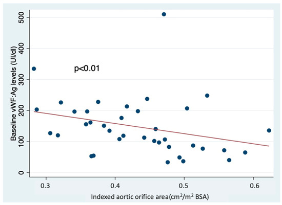 The mean von Willebrand factor antigen on admission (VWF:Ag) level was 145.94 ± 91.87 UI/dL [IQR: 82.9–198]. Four patients had a preoperative VWF:Ag level <50 UI/dL. Preoperative von Willebrand antigen levels were inversely correlated with the indexed aortic valve surface area (rho = −0.41, p < 0.01) (Figure 1). After the procedure, the values of von Willebrand factor antigen increased to 289.26 UI/dL [IQR: 157.7–345.4] (p < 0.01), and no such correlation was found with the indexed orifice area of the implanted prosthesis (rho = −0.22, p = −0.16). Furthermore, all four patients who had, at baseline, VWF:Ag < 50 UI/dL increased their plasmatic level to >80 UI/dL after having their aortic pathology treated.