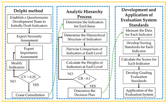 The research process of this study is illustrated in Figure 1. First, the Delphi method was employed to invite experts to evaluate the necessity and importance of the preliminary-drafted indicators. Consultation ceased when expert opinions tended to converge and the establishment of the evaluation index system was completed. Subsequently, a hierarchical structure model was constructed. The AHP was then used to address the qualitative and quantitative analyses of each indicator, providing an in-depth analysis of the complex decision-making problem from the perspectives of the essence of the problem, influencing factors, and their intrinsic relationships. This approach aims to offer concise and clear decision-making solutions. Finally, the completed decision-making plan was applied in practice to verify and support these evaluation system standards further.