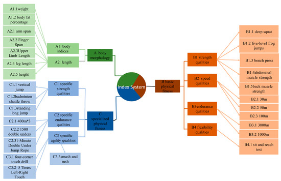 Badminton is considered the most demanding racquet sport in the world [51,54]. Athletes need to make quick movements and change directions as necessary, which undoubtedly requires them to possess excellent strength, speed, endurance, and flexibility [55]. Tiwari et al. [56] found a significant correlation between these qualities and athletes’ competitive abilities in studies of sub-elite athletes. Therefore, relative strength, speed, endurance, and flexibility were included in the basic physical fitness indicators. Relative strength was included with four tertiary indicators: deep squat, bench press, abdominal muscles, and back muscles. Deep squats and bench presses are essential indicators for assessing an athlete’s strength, reflecting the lower and upper body strength critical for jumping and hitting in badminton [21,57]. Evaluating the abdominal and back muscles helps understand the athlete’s core strength, which is crucial for maintaining body stability and power transfer. Quick movements, posture changes, hitting power, and accuracy in badminton require strong core strength and high dynamic balance [28,58].