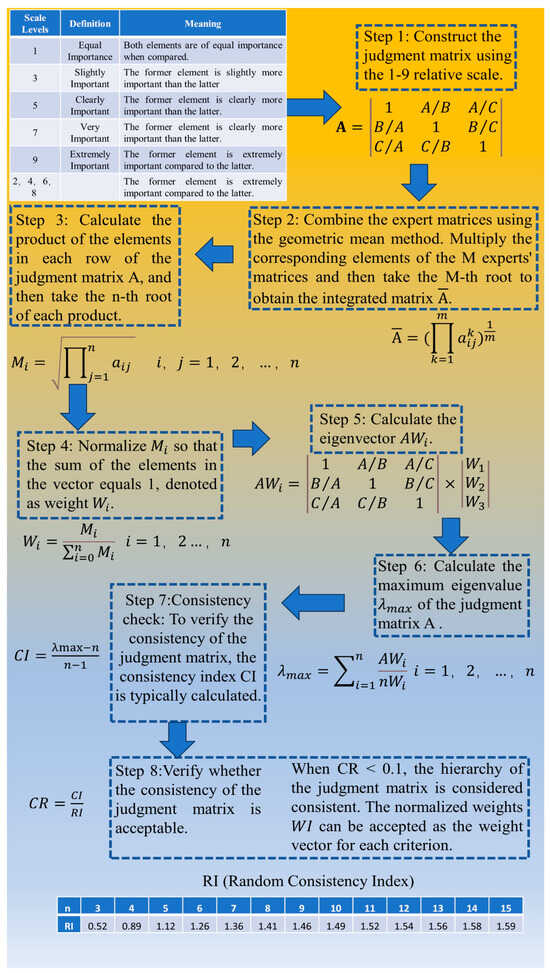The AHP establishes a hierarchical structure model composed of the overall goal, criteria, and candidates, each of which is independently unaffected by the others. Based on different evaluation factors, candidates are compared pairwise according to the 1–9 relative ranking scale provided by Saaty to form a comparative judgment matrix. The scoring matrices of all experts are combined into a judgment integration matrix using the geometric mean method, and the weight value of each candidate relative to the overall goal is calculated [38,39]. Through this process, the relative importance of each indicator at each level is judged, thus quantifying subjective evaluations and systematically assessing the importance weights of each indicator relative to the overall goal. The specific calculation process can be seen in Figure 3.