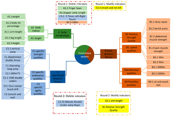 The purpose of the first round of expert consultation was to assess the necessity of the initially drafted three primary indicators, nine secondary indicators, and 27 tertiary indicators using the options “Select”, “Delete” and “Modify”, with a consensus threshold set at 70% [40]. The results of the expert consultation indicated that no modifications, deletions, or additions were needed for the primary and secondary indicators. However, for the tertiary indicators, “Finger Span”, “Upper Limb Length”, “100 m Run” and “5 Times Left-Right Touch” were deleted. Additionally, “Smash and Rush” was modified to “Smash and Net Kill”.