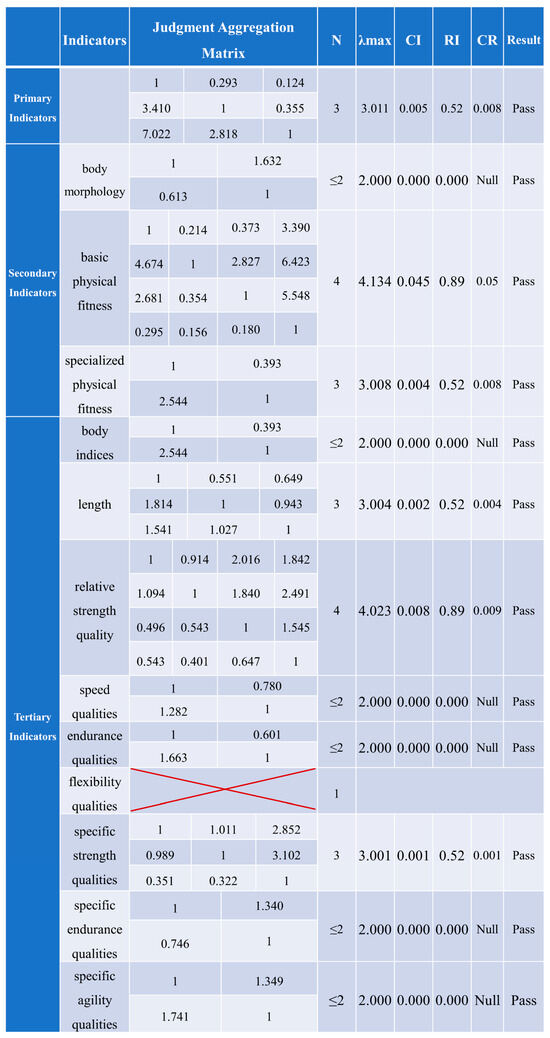 For non-rhythmic sports such as badminton, handball, and basketball, traditional physical fitness testing methods using standard bicycles or treadmills are insufficient to accurately predict an athlete’s performance in competition [27]. Therefore, this study included specialized physical fitness as one of the primary indicators to ensure the evaluation results accurately reflect the physical demands and performance levels required in actual matches. Within the specialized physical fitness primary indicator, three secondary indicators were included: specialized strength, specialized endurance, and specialized agility. These indicators aim to assess the specific physical fitness requirements of athletes in badminton matches. Specialized Strength: The tertiary indicators of vertical jump, badminton throw, and standing long jump effectively assess the athlete’s explosive power and strength application ability, which are crucial for jumping and hitting actions [18,51,57,63]. Specialized Endurance: The 400 m×5 and 1-min double-under jump rope tests evaluate the athlete’s ability to sustain high-intensity activity throughout the match, ensuring they can maintain high performance levels during the later stages of the game [51,64,65]. Specialized Agility: Agility refers to the ability to rapidly change the speed or direction of the entire body in response to specific stimuli during movement [66]. The tertiary indicators of smash and net kill and the four-corner shuttle run assess the athlete’s quick reaction and agility, which often determine the outcome of a match in critical moments [67]. The inclusion of specialized physical fitness ensures that the evaluation system is comprehensive and tailored to the specific demands of badminton, providing a more accurate assessment of the athletes’ capabilities and performance potential in real match scenarios.