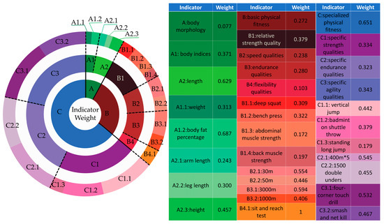 Weight of each indicator in the physical fitness evaluation system for elite male badminton singles players.