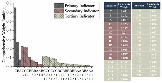 Figure 6 shows that the weight matrices provided by the experts passed the consistency test. The process involves first calculating the weights of the primary indicators, then the secondary indicators and tertiary indicators within the same level. Subsequently, the global weights of the secondary and tertiary indicators are calculated (Figure 7).