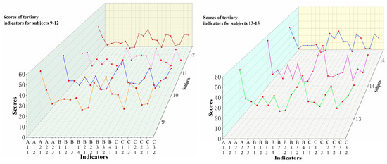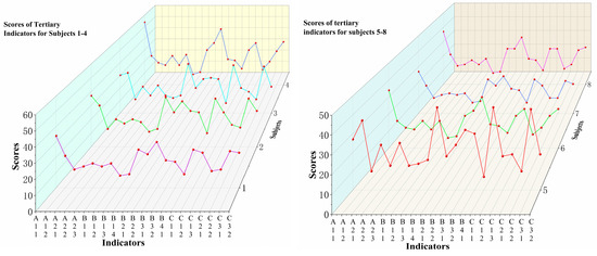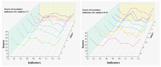 The comprehensive score results are obtained by combining individual scores with weights using the following calculation formula: , where represents the score of each indicator, and represents the weight of each indicator. The calculation steps for the comprehensive evaluation results are as follows: Calculation of secondary indicator scores: Multiply the scores of each tertiary indicator by their respective weights and obtain their sum to determine the scores of each secondary indicator. Calculation of primary indicator scores: Multiply the scores of each secondary indicator by their respective weights and obtain their sum to determine the scores of each primary indicator. Calculation of comprehensive evaluation result: Multiply the scores of each primary indicator by their corresponding weights and obtain their sum to obtain the comprehensive evaluation result. The weighted scores for each level of indicators are shown in Figure 9, Figure 10 and Figure 11.