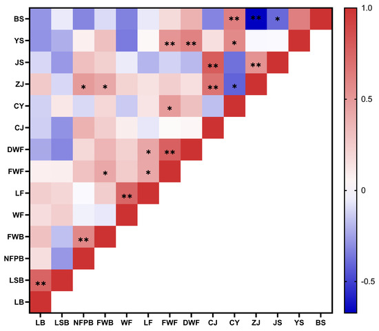 Correlations among eight fruit characteristics and six lignans. LB: length of fruit bunch; LSB: stalk length of fruit bunch; NFPB: number of fruits per fruit bunch; FWB: weight of fruit bunch; WF: width of fruit; LF: length of fruit; FWF: fresh weight of fruit; DWF: dry weight of fruit. CJ: Schisandrol A; CY: Schisandrol B; ZJ: Schisantherin A; JS: Schisandrin A; YS: Schisandrin B; BS: Schisandrin C. * indicates significant difference in p < 0.05 level; ** indicates significant difference in p < 0.01 level.