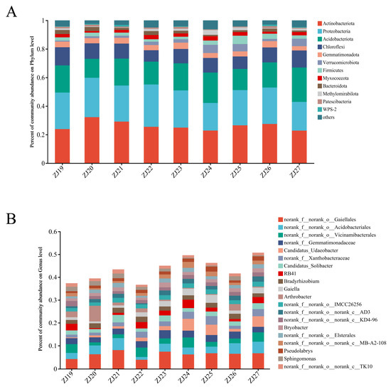 At the phylum level, species composition analysis identified twelve phyla with abundances greater than 1%. Actinobacteriod was the dominant phylum at 28%, followed by Proteobacteria at 26%, Acidobacteriota at 19%, and Chloroflexi at 10% (Figure 3A). The top 20 genera by abundance included Candidatus_Udaeobacter, Candidatus_Solibacter, RB41, Bradyrhizobium, Gaiella, and Arthrobacter. The abundance of Arthrobacter and Sphingomonas in samples ZJ24, ZJ25, and ZJ27 was extremely low, while the abundance of Candidatus_Udaeobacter was lowest in sample ZJ19, and RB41 was lowest in sample ZJ20. Arthrobacter had the highest abundance in sample ZJ20 (Figure 3B).