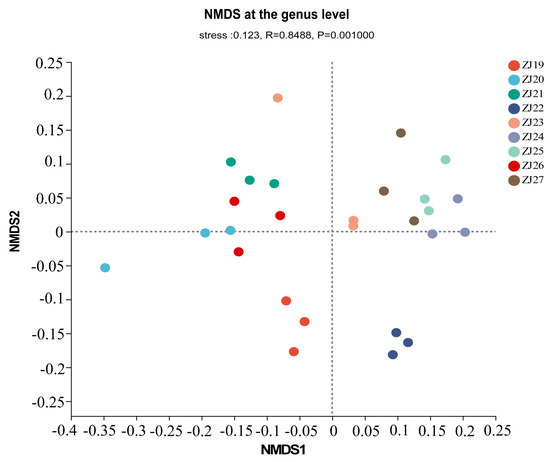 In the NMDS analysis, the similarity of bacterial composition at the genus level among different samples was examined. The results indicated an R value of 0.8488 and a p value of 0.001, suggesting significant differences in rhizosphere microbial composition among the nine Schisandra resources (Figure 4).