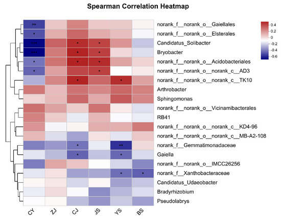 Correlation analysis between rhizosphere microorganisms and lignans in S. chinensis. CY: Schisandrol B; ZJ: Schisantherin A; CJ: Schisandrol A; JS: Schisandrin A; YS: Schisandrin B; BS: Schisandrin C; * means significant difference between samples (p < 0.05); ** means significant difference between samples (p ≤ 0.01); *** means significant difference between samples (p ≤ 0.001).