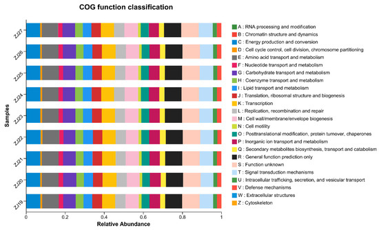 Prediction of rhizosphere microbial function; A~Z indicate function numbers and descriptions of COGs.