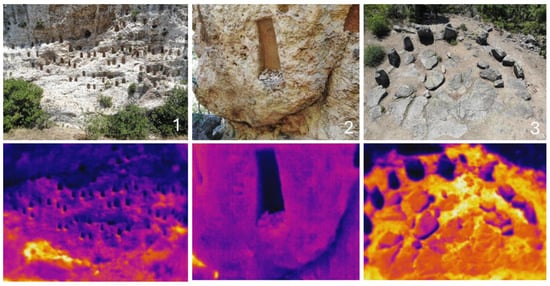 Examples of measurement of the temperature on the megalith surfaces by application of a drone: Kovan Kaya—general view (1) and one of the rock niches magnified (2), Cromlex—general view (3). On the lower row—the same places in the same order with differences in the temperatures measured by the drone. The temperature variations from cold to hot are expressed by blue-violet and yellow-orange colors.