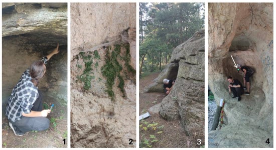 Examples of collecting the material from visible algal layers and measuring the temperature on the megalith surfaces of Evdzhika (1–3) and Gluhite Kamuni (4) by application of a thermal camera (indicated by white arrow).