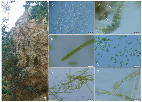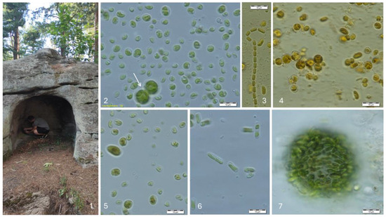 The rock sanctuary Evdzhika near the village Hlyabovo (front view—(1)) with examples of some species growing in the cultures: Muriella decolor (arrow) and Elliptochloris bilobata (2), Stichococcus chlorelloides (3), Muriella terrestris (4), Elliptochloris subshaerica (5), Stichococcus mirabilis (6), and Sphaerococcomyxa olivacea (7). Photos (3–5) are taken after staining with Lugol’s solution.