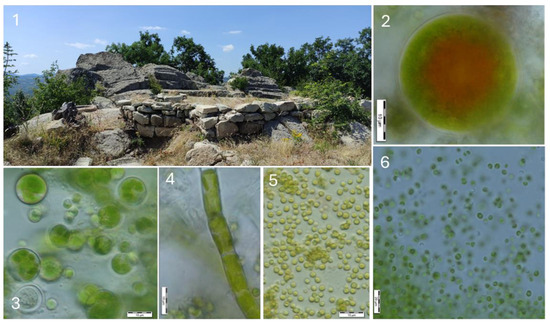Thracian complex near village Angel Voyvoda (part of the complex with old rock sanctuaries, remnants of fortress walls, and circular rock excavations—(1)) with examples of some identified algae: Pseudodictyochloris multinucleata (2), Apatococcus lobatus (3), Tribonema minus (4), Pleurochloris commutata (5), and Chloridella minuta (6).