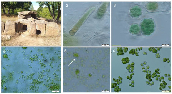 Tsarski Dolmen (1) and examples of species growing in the obtained cultures: Calothrix sp. juv. (2), Nostoc minutum (3), Edaphochlorella mirabilis (4), Scotiella tuberculata (arrow) surrounded by cells of Chloroideum ellipsoideum (5), and Desmococcus olivaceus (6).